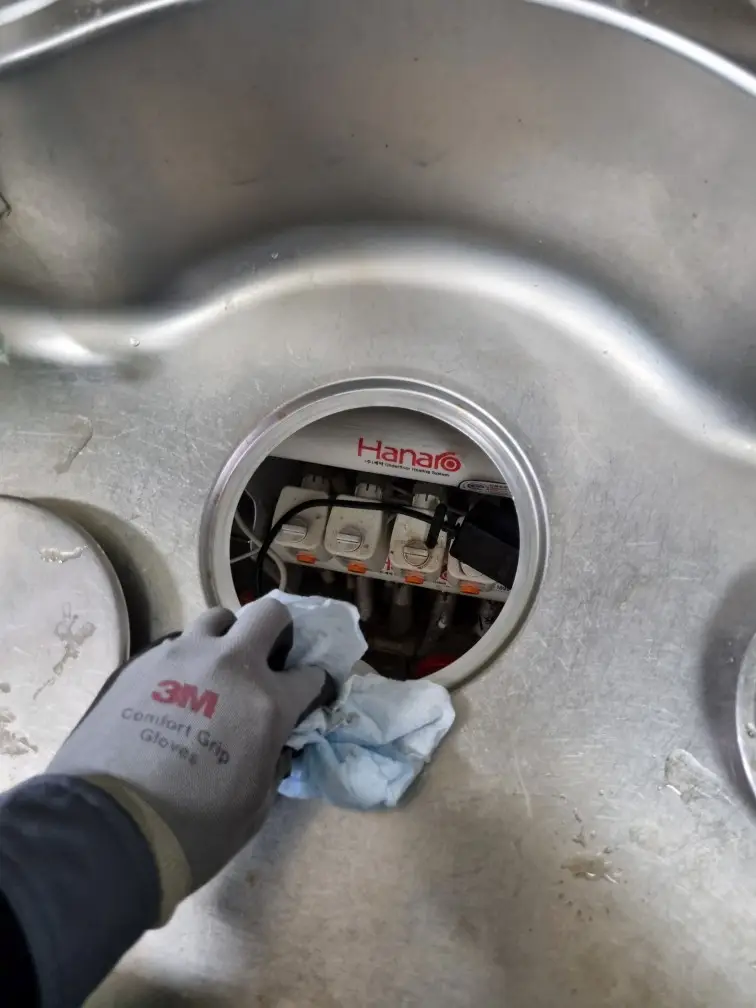 배수구통을 제거한 후 싱크대 하부 연결부를 깨끗하게 청소했습니다. 오래된 실리콘과 이물질을 완전히 제거해야 새 배수구통이 제대로 밀착됩니다. 이 과정이 마무리의 깔끔함을 좌우하기 때문에 꼼꼼하게 진행했습니다.