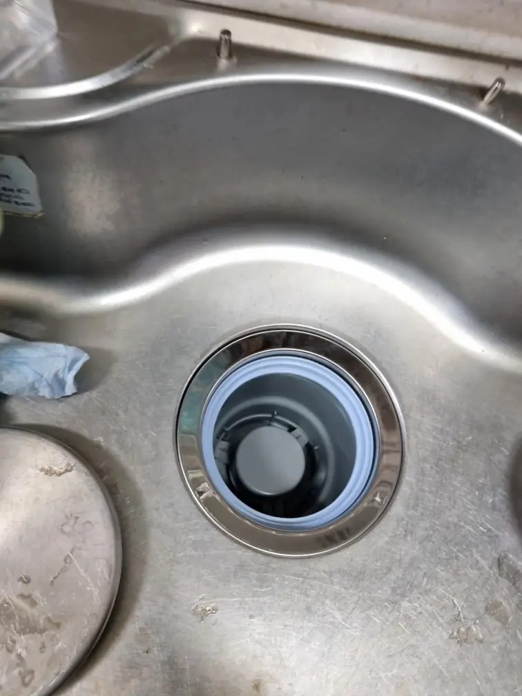배수구통 상부에 새로운 배수구를 설치했습니다. 배수구는 물을 받아둘 수 있는 구조로, 팝업과 연결되어 배수 기능을 제어합니다. 배수구를 배수구통에 정확히 맞춰 설치하고 고정했습니다.